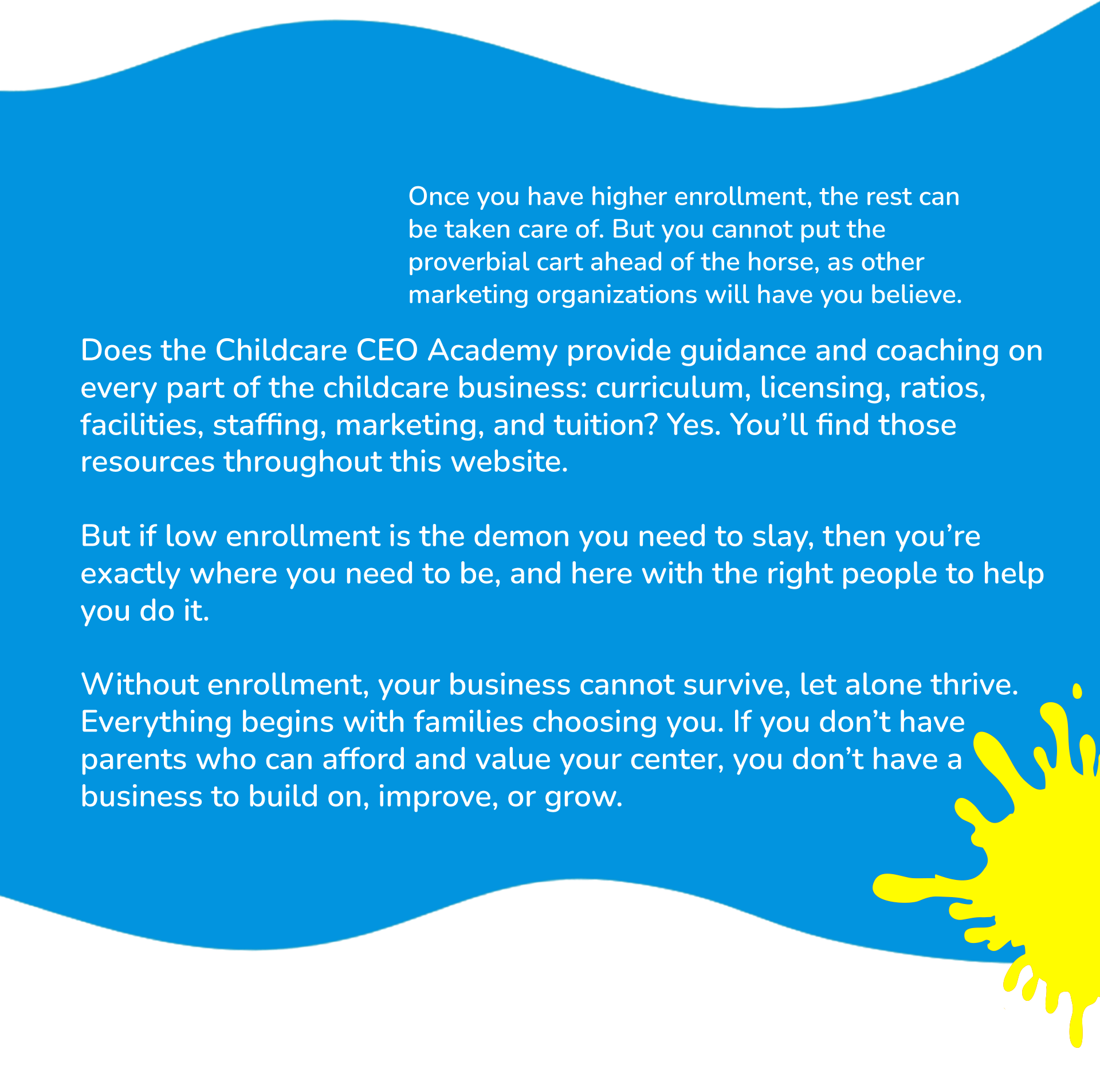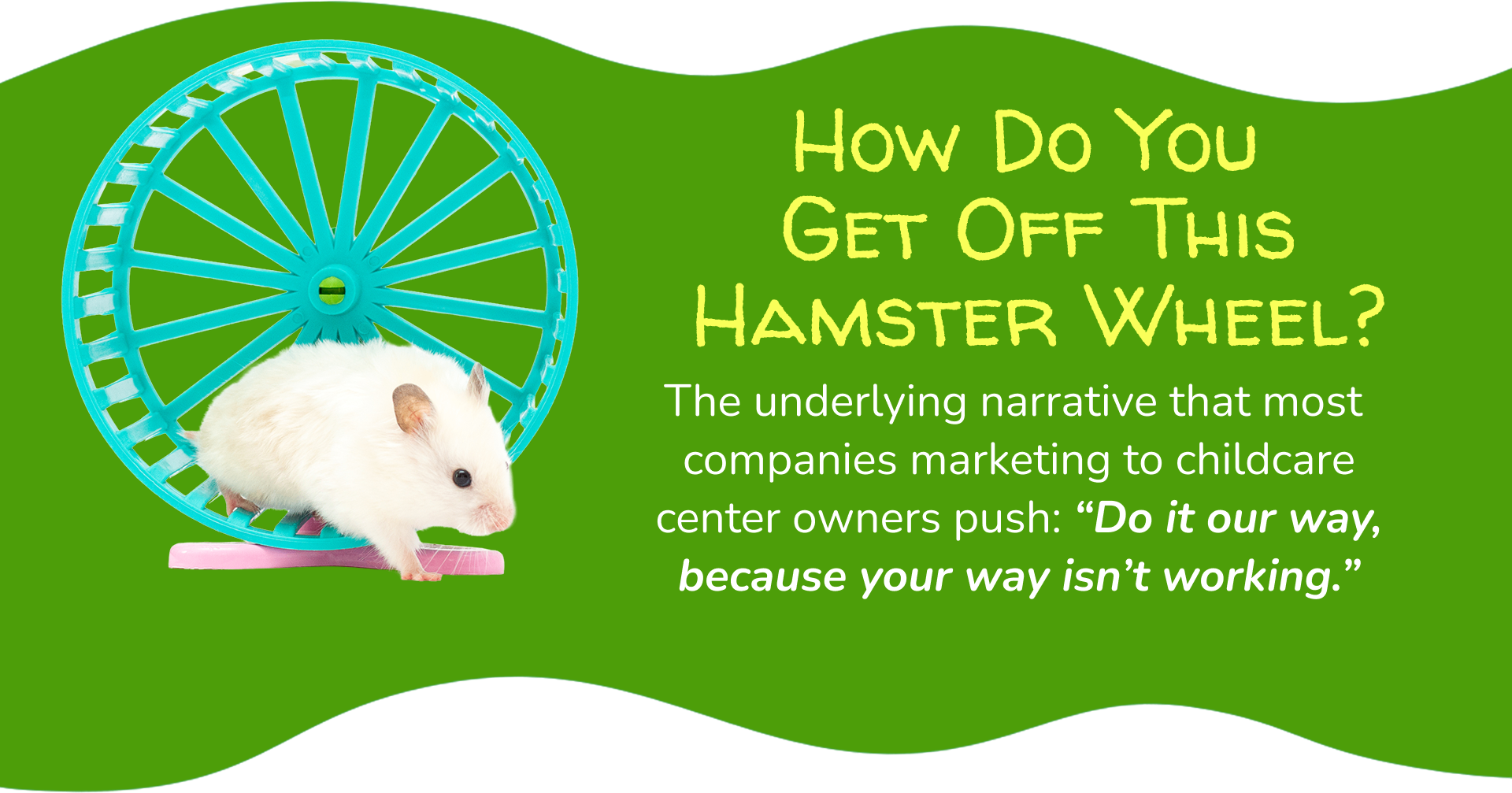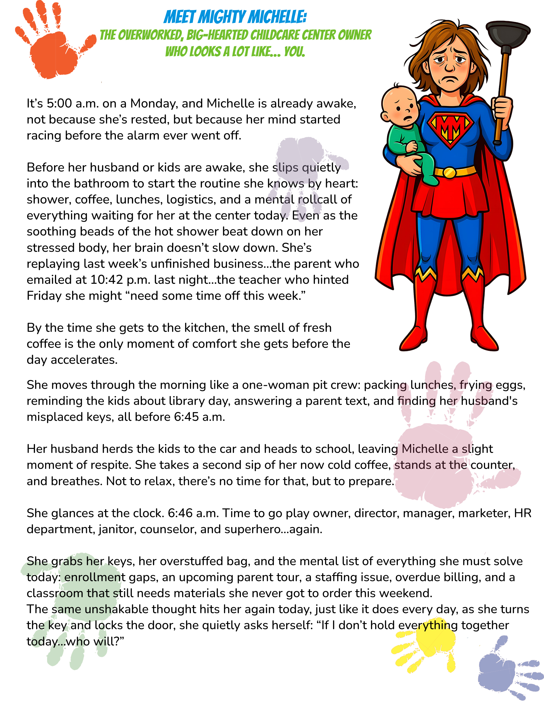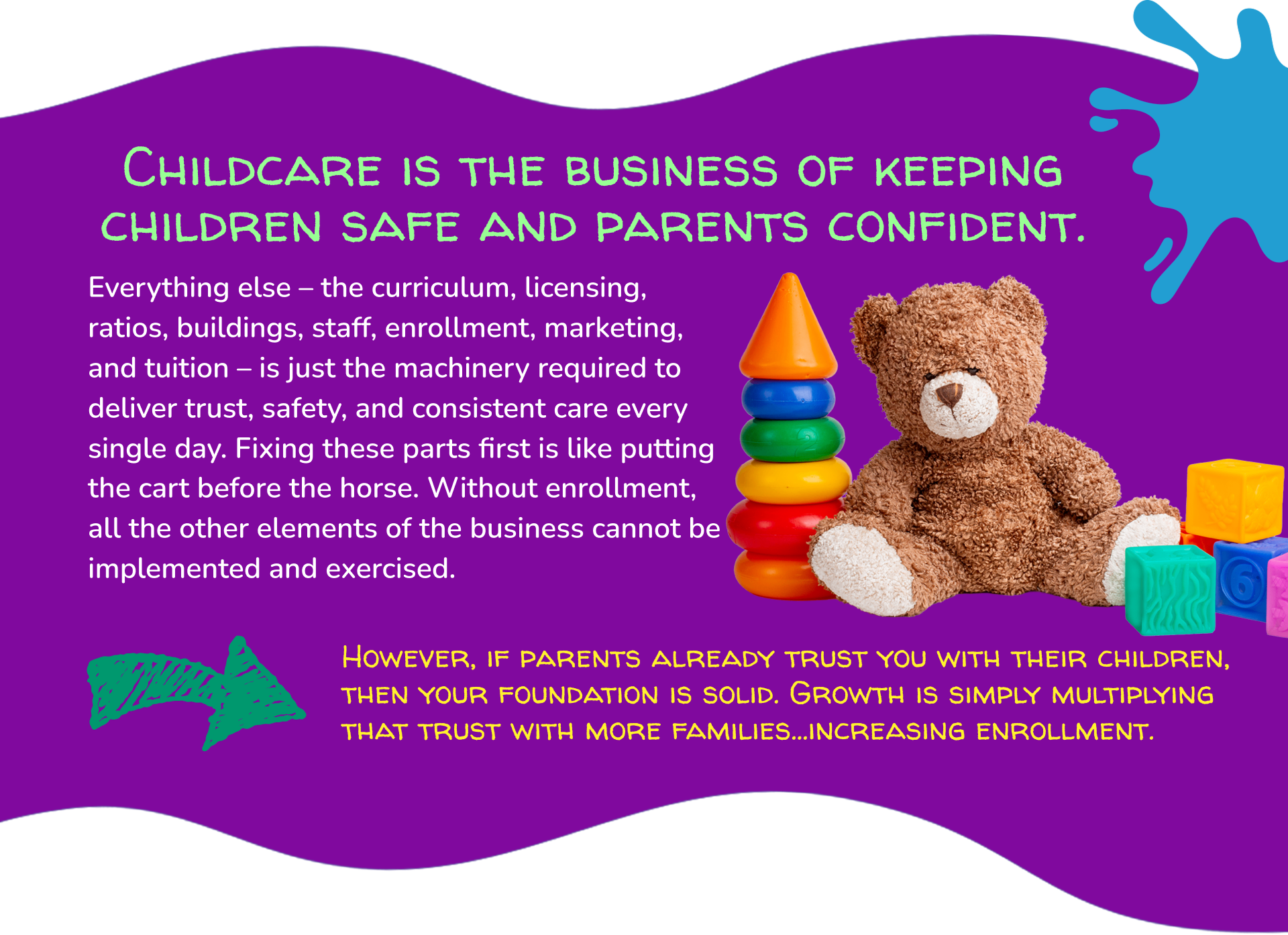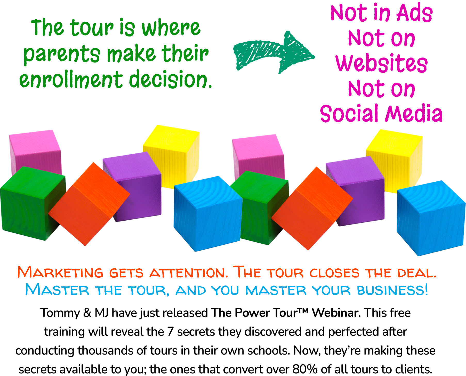It’s the small, deliberate, personal moments, walking parents through the halls, introducing them to teachers, letting them feel the warmth of the classrooms, and inviting them into the culture of the center. This is the putting green of childcare. This is where enrollment decisions are made. And yet, no marketing company talks about it because they can’t package it, automate it, or sell it as a ‘done-for-you’ service for which they can charge. It is something you, the childcare center owner is best qualified to do.